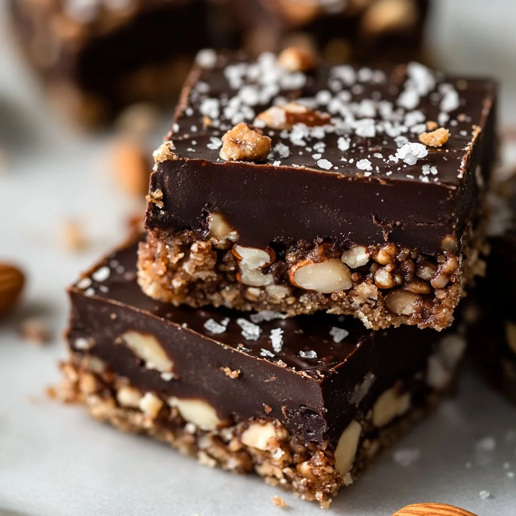 Barrette di noci al cioccolato fondente e sale marino in una presentazione appetitosa.