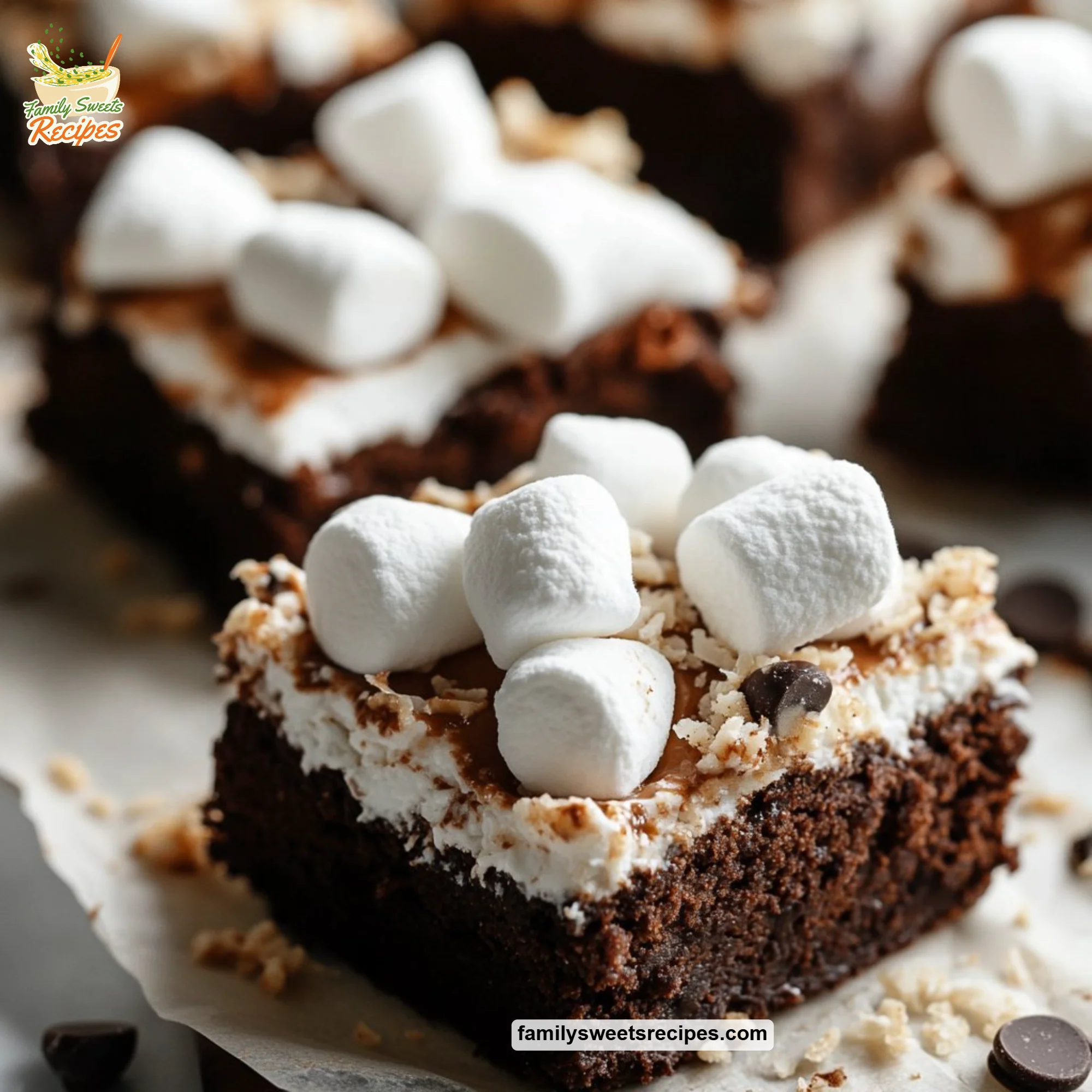Once the brownies have cooled, spread the marshmallow mixture evenly over the top. Then, sprinkle the shredded coconut on top, pressing gently to ensure it sticks to the marshmallow layer.